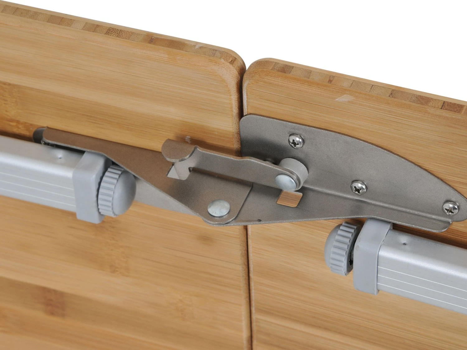 Wil jij je campingplek graag sfeervol inrichten? Kies dan voor campingmeubelen van bamboo, zoals deze klaptafel van Obelink. De tafel heeft een afmeting van 140 x 70 cm en is in hoogte verstelbaar van 58 cm tot 70 cm hoog. De poten zijn voorzien van stelvoetjes zodat de tafel ook op een ongelijke ondergrond recht kunt neerzetten. Het frame is gemaakt van lichtgewicht aluminium en het bamboo blad kan wel tegen een onverwachte regenbui.