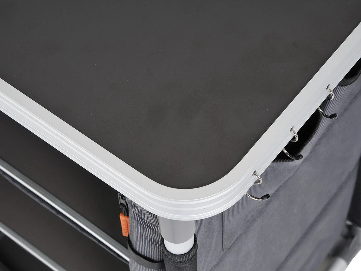 De kast is voorzien van vier verstelbare poten zodat je de kast altijd waterpas kunt zetten op een ongelijke ondergrond. Het blad is van MDF en afgewerkt met een aluminium rand. Hierdoor is de kast NIET water- en hittebestendig.